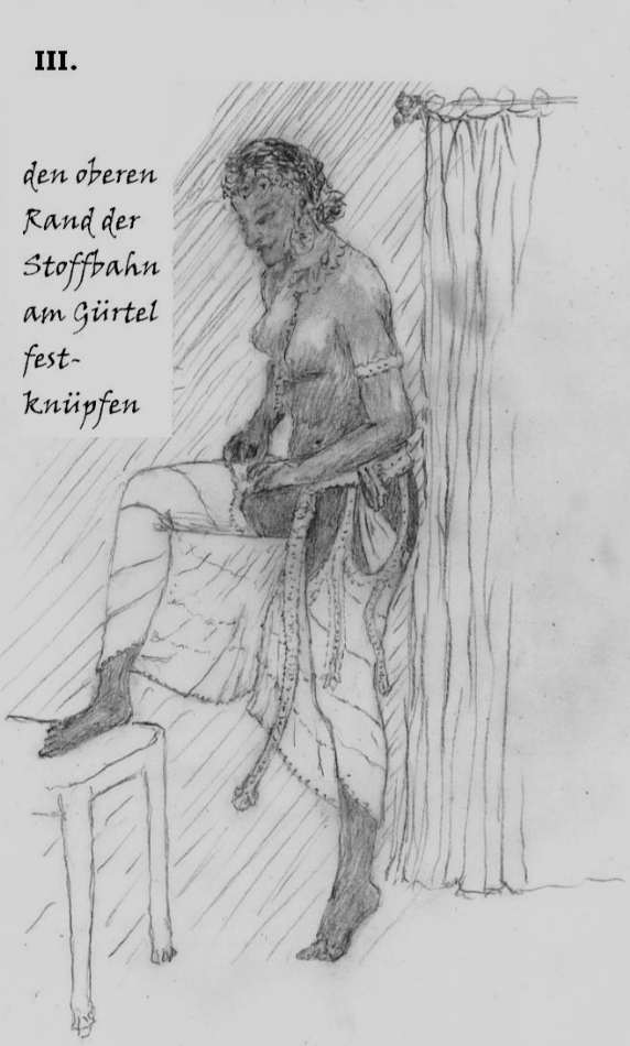 Wie war die Kleidung gestaltet? Ich finde es schwierig, das zu erkennen. Besonders die Beinkleidung ist so wie wir es nicht kennen. Seht euch die Fotos an. Ich habe an vielen einzelnen Skulpturen untersucht, wie sie wohl geformt war. In eigenen und fremden Fotos. Und habe es als Zeichnungen gedeutet und vorgestellt. An den Beinen trugen die Leute weder lange Hosen noch lange Strümpfe in unserem Sinn. Meine Deutungen sind: es handelt sich um ein langes und weites Tuch, das in besonderer Art gefaltet und umgewickelt wurde. Doch da gab es einige Unterschiede. Dieses Tuch nenne ich "Wickelstrümpfe".